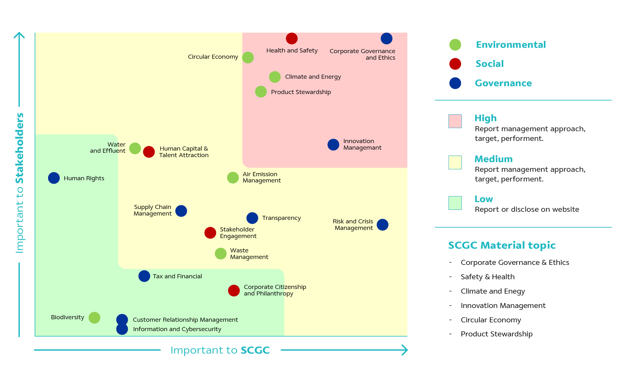 คณะกรรมการการพัฒนาอย่างยั่งยืน เอสซีจี เคมิคอลส์ หรือเอสซีจีซี ได้ระบุประเด็นการพัฒนาอย่างยั่งยืนที่สําคัญของ บริษัท (Enterprise Materiality) ในปี 2564 โดยทบทวนประเด็นการพัฒนาอย่างยั่งยืนที่จัดทําขึ้นในปี 2560 ประกอบกับ การพิจารณาแนวโน้มการเปลี่ยนแปลงที่สําคัญทั้งในระดับโลกและระดับภูมิภาค ความคิดเห็นจากผู้มีส่วนได้เสียที่สําคัญ ประเด็นการพัฒนาอย่างยั่งยืนในอุตสาหกรรมเดียวกัน ความเสี่ยงและโอกาสที่อาจเกิดขึ้นตลอดห่วงโซ่คุณค่า อ้างอิงตามกรอบการรายงานความยั่งยืนสากล Global Reporting Initiatives (CRI) ฉบับ GRI Standards